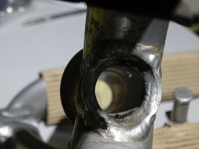 Die Gabel, Vorderrad, der Steuersatz und die Lenksäule mit Andros Vorbau müssen in jedem Fall neu. Die Gabel ist am obern Ende direkt beim Rahmen abgeknickt.