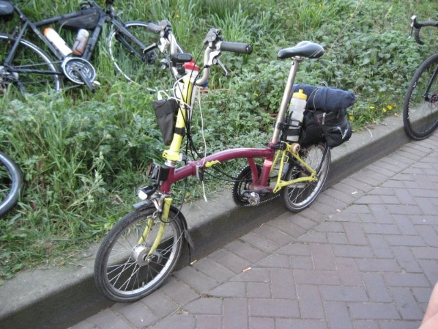Es wurde die Zahl von 130 Startern genannt. Das sah schon beindruckend aus, als wir uns gemeinsam auf den Weg begeben haben. Ich war eigentlich schon müde (7:00 augestanden, Gartenarbeit, Einkäufe, Auslauf mit dem Hunden, Sightseeing Amsterdam per Rad). Dieses Mal war ich nicht alleine mit meinem Klapprad, ein junger Engländer war mit seinem "Renn-Brompton" angereist. Für ihn war es seine erste 400 km Rundfahrt. Sein Rad (s. Foto) ist 5 Jahre alt und hat ca. 20000 km gelaufen.