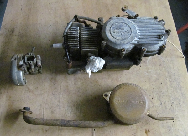 Der Motor ist bis auf ein Teil am Vergaser wohl auch komplett. Beim Vergaser handelt es sich aber wohl um einen Standard Dellorto SHA 149 der auch bei anderen Fahrzeugen verbaut wurde so das man Ersetzteile gebraucht oder neu bekommen kann. Ob er läuft wird sich dann zeigen wenn der Vergaser wieder komplett ist.