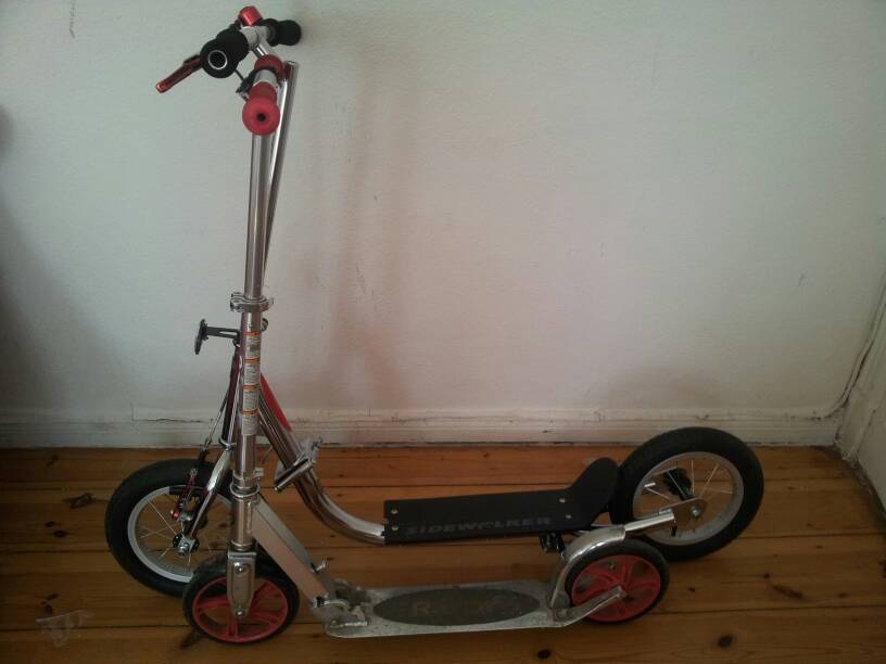 Erste Eindrücke: Enorm hohes Trittbrett, wie zu erwarten war. Paar Meter gefahren, wirk wie auf Treibsand. Erstmal die Luftbereifung auf 6 Bar aufgepumpt, dürfte deren Platzgrenze sein. Rolleigenschaften sind dann ganz brauchbar. Durch das hohe Trittbrett ist man aber trotzdem einiges langsames als mit dem viel kompakteren Razor A5 Lux (siehe Vergleichsbild). So als Roller ist das Sidewalker daher leider nicht brauchbar. Es ist auch zu schwer und zu träge. Mit den dicken Luftreifen, sind ca 55mm breit, und dem langen Radstand aber sehr fahrstabil. Ideales Chassis für Elektrifizierung.