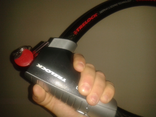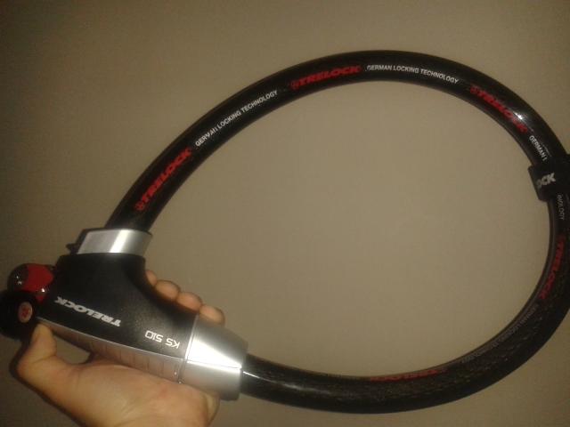 Hier das Trelock KS510 in 85cm Länge, Ø28 mm (Sicherheitsstufe 5 von 6). Es wiegt ca. 1,3kg. Der Kopf lässt sich mit der Hand nicht umschließen und man kann das Hinterrad nicht mit absichert, weil es nicht zwischen die Speichen passt. Ich finds ziemlich klobig.