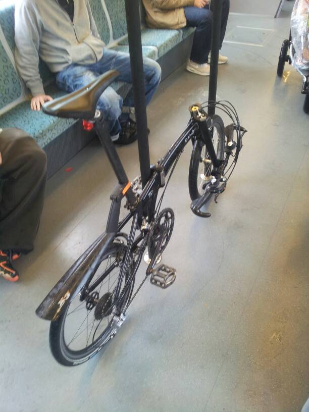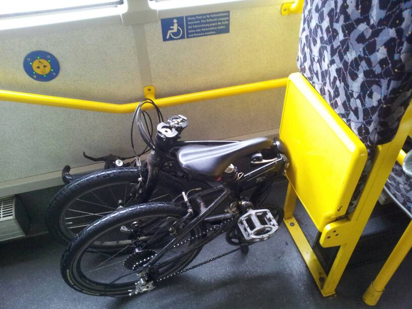 Mu Ex im Bus. Den nehme ich nur bei Regen, selten, aber die Option zu haben ist top. Im vollen Bus ist das Rad etwas sperrig und der aussenfaltende Lenker stört. Dafür faltet es sehr flott und ist leicht (zu tragen). So anlehnen, dass es gegen die Wand kippt, denn leider steht es nicht von alleine sicher. Wenn man öfter Bus fährt, lohnt sich vielleicht ein Sicherungsgummi o.ä., teilweise sind die Busse aber auch voll bis zum Anschlag, dann ist das mit einem 20“ Dahon nicht wirklich ideal.