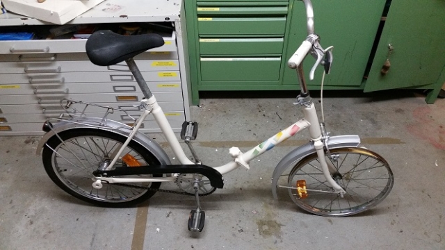 es tut mir leid, aber wenn ich ein so lieblos "überarbeitetes" und übermaltes Klapprad sehe, gehen bei mir alle Alarmglocken an. Es sieht Elite-ähnlich aus, ich meine aber, dass die wirklich ein Klappgelenk in der Rahmenmitte hatten. Der Rahmen ist über 45 Jahre alt und es würde nicht so aussehen, wenn es nicht intensiv genutzt worden wäre und schon einiges durchgemacht hätte. So ein alter Rahmen kann auch mal brechen und zu üblen Verletzungen führen. Sicher kann man mit diesem Rad nicht mehr unterwegs sein, außer man schiebt es neben sich her.