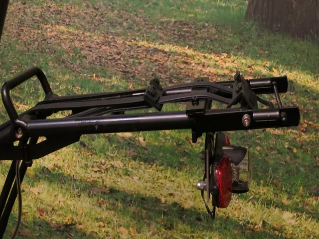 Gestoppt wird die Wippe im Moment durch eine über den Gepäckträger montierte Alu Schiene (4mm stark). Das war ein Reststück, wenn alles dauerhaft funktioniert, werde ich sie durch eine schönere ersetzen.