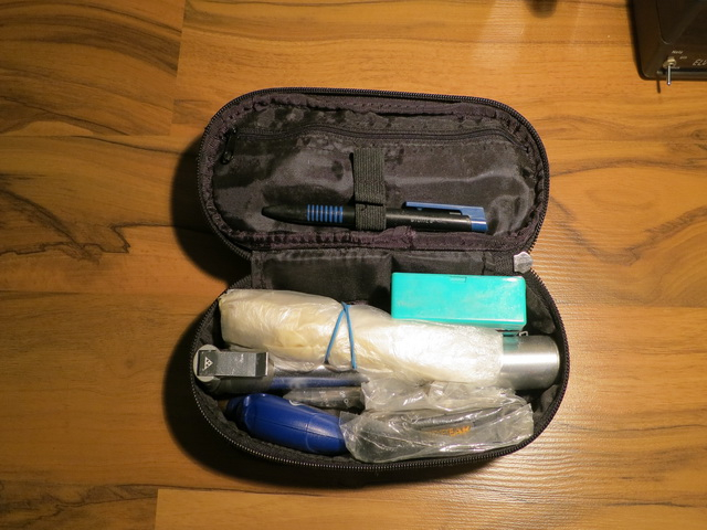 Das sieht ja fast so aus wie bei mir. Hier der Inhalt meines Mini-Kulturbeutels von irgendeiner Flugreise. Die Luftpumpe habe ich am Körbchen befestigt, obwohl sie auch hier mit reinpassen würde.