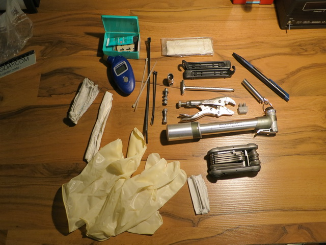 Das nehm ich auch genau so mit, wenn ich länger mit dem Rad unterwegs bin. (+ Reserveschlauch) Zum Umpacken Alltag/Radtour bin ich zu faul. Da ich mehrere Räder benutze ist Werkzeug für alle drin. Die meisten Dinge sind noch mal in kleine Gefrierbeutel verpackt, damit nix unterwegs rappelt.