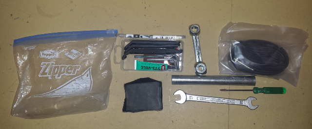 Ich hab mein Täschchen auch mal ausgepackt. Dies habe ich nun angepaßt für das Dahon. Ein Hebel für das Vorderrad ist auch dabei (bekomme ich so nicht auf) und das schwarze ist eine faltbare ;) Schachtel für die Schrauben und Kleinteile.
