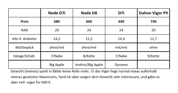 Ich helfe nur entsprechende Auswahlkriterien zu kennen. Entscheiden muss jeder selbst. Aber auch einen Fehlkauf kann man ja immer später noch loswerden. Falträder werden ja immer beliebter.