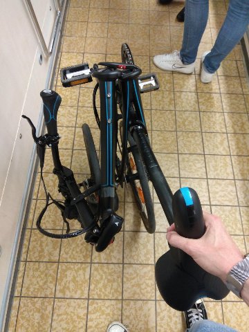 Im gefalteten Zustand kann man mit einer höheren Satteleinstellung das Fahrrad durch U-Bahn Ebenen vor sich her schieben.
