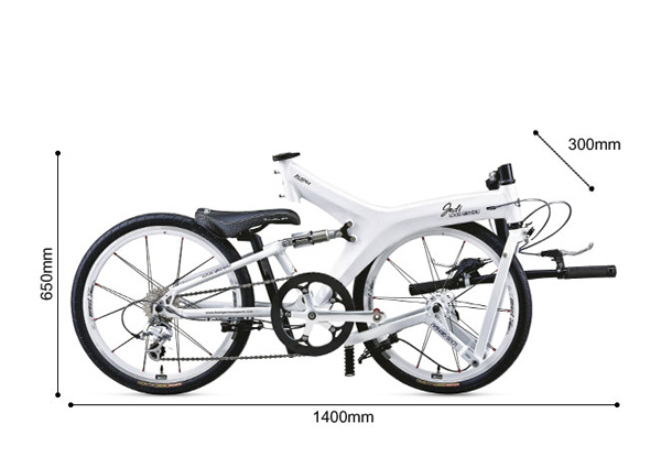 Sieht auf den ersten Blick wie ein Birdy mit einer richtigen Hinterradfederung aus. Beim genauen Hinsehen zeigt sich aber, daß die Konstrukteure offenbar nicht zu Ende gedacht haben: Weil man den Hinterbau nicht untenherum schwenken kann, beträgt das Faltmaß 140 cm