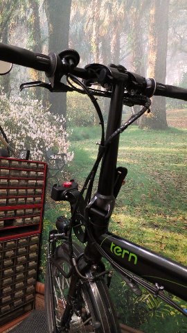 Bei einem Blick auf aktuelle Tern-Modelle im Laden fiel mir auf, dass die Züge schon leicht anders liegen. Der Zug der vorderen Bremse geht links am Lenkkopf vorbei, die beiden nach hinten sind rechts. Bei mir liegt Alles links - auch die Lichtleitungen.