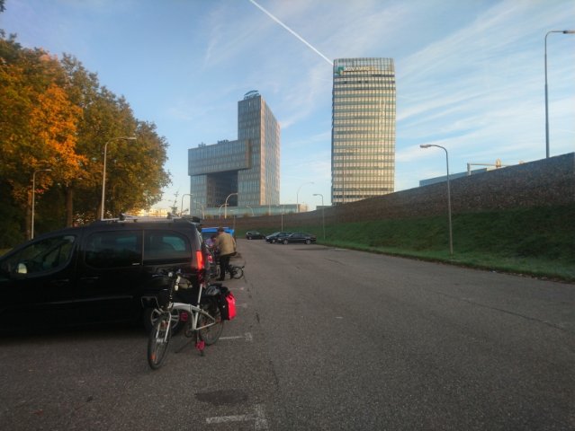 Mein Parkplatz außerhalb von Zwolle: Im Hintergrund werden gerade zwei Bromptons für einen Stadtbummel vorbereitet (auf die Idee kommen mittlerweile viele, keine Parkplatzsorgen)