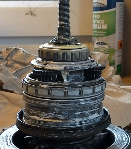 In dem "Planetenradteil" selbst würde ich dann zur Reinigung mit dem Pinsel arbeiten. Die Reinigung und Neufettung der Sperrklinken sollte sorgfältig durchgeführt werden, da Probleme mit "Leertritten" häufig verklebte Sperrklinken zur Ursache haben. Federbruch oder erschlaffte Federn kommen dabei auch schon mal vor.