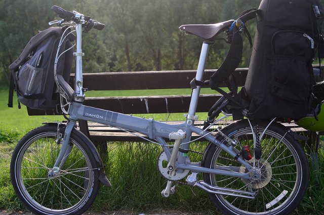 "Beim Verlasten in Bahn, Bus etc, sind die Ortliebs mit einem Handgriff abgeklippst und neben oder über dem gefalteten Rad verstaut."