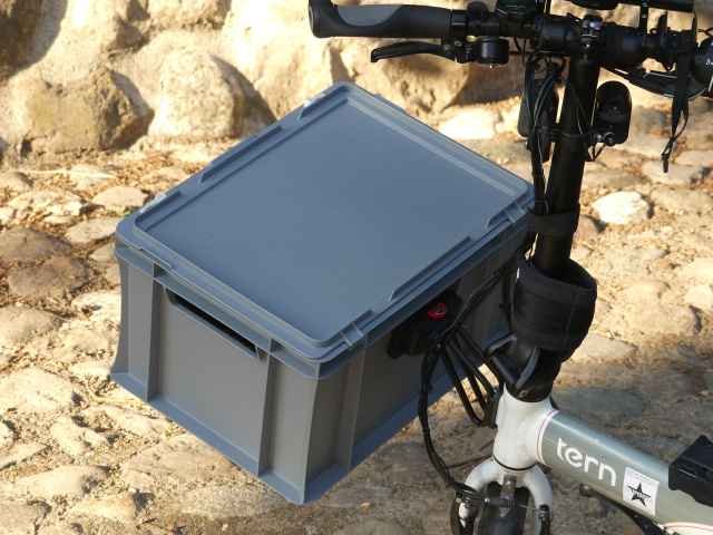 Statt einer Lenkertasche / Körbchen habe ich mir die Klickfix-Haltepaltte an einer (kleinen) Euro-Normkiste