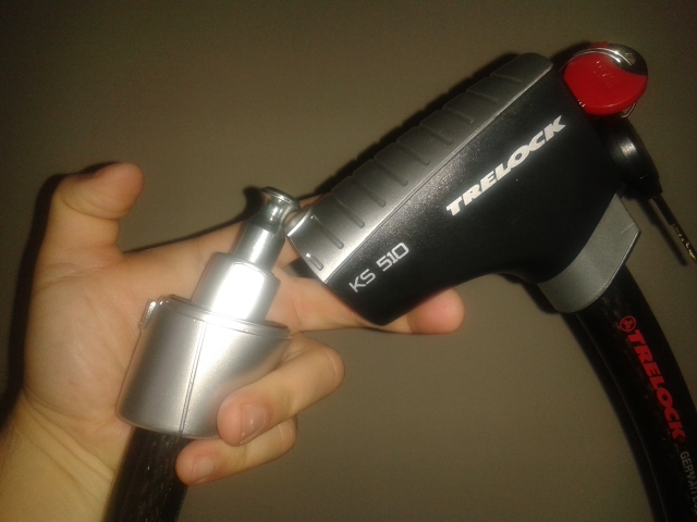 Hier das Trelock KS510 in 85cm Länge, Ø28 mm (Sicherheitsstufe 5 von 6). Es wiegt ca. 1,3kg. Der Kopf lässt sich mit der Hand nicht umschließen und man kann das Hinterrad nicht mit absichert, weil es nicht zwischen die Speichen passt. Ich finds ziemlich klobig.