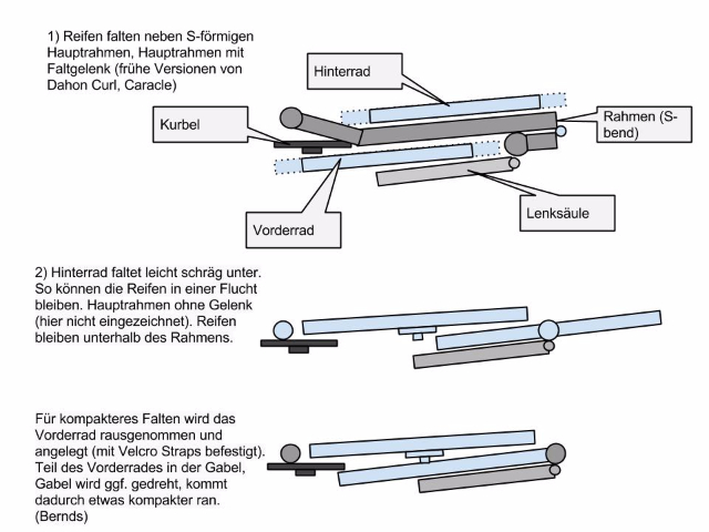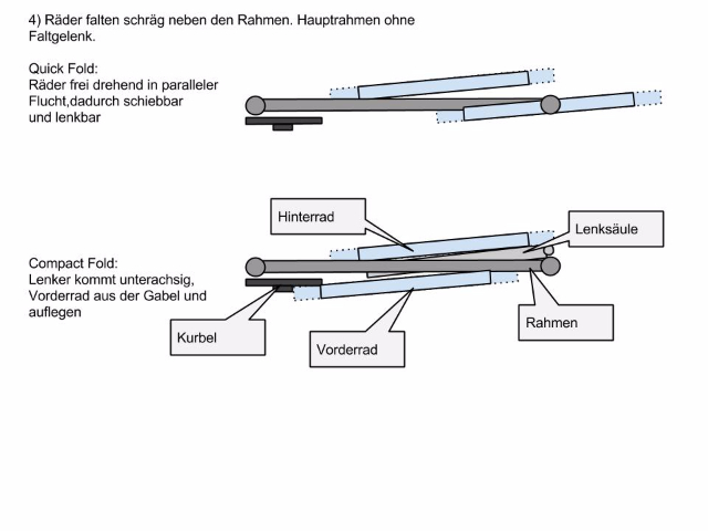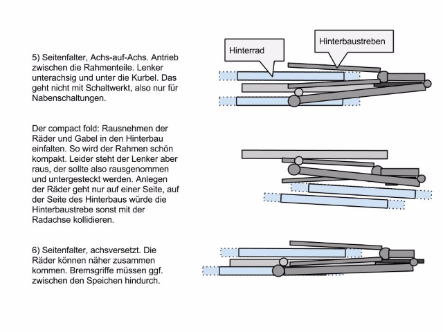3) das ganze geht natürlich auch ohne Schrägversatz, also wie etwa beim Bernds. Dann muss dass Hinterrad im Schiebemodus allerdings etwas früher arretiert werden, damit die in einer Flucht bleiben. Dafür kann der Lenker nach innen gefaltet werden, das Vorderrad dann außen drauf (Skizze folgt). Das ist imho sehr nah an einem möglichen "Optimum". Bernds müsste das nur mal besser vermarkten