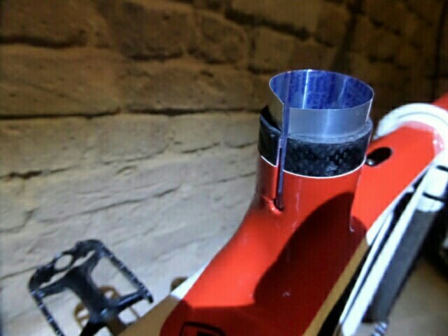 Die Schwierigkeit bei der Fertigung einer Hülse aus Coladosenblech ist, diese gleichmäßig (ohne Knicke und Beulen) zu wickeln. Da könnte eine Schlosserei hilfreich sein. Hat man eine solche Hülse, kann die auch im Sitzrohr eingeklebt werden (Evtl, nach dem diese Hülse im eingebauten Zustand "eingeritten" wurde).