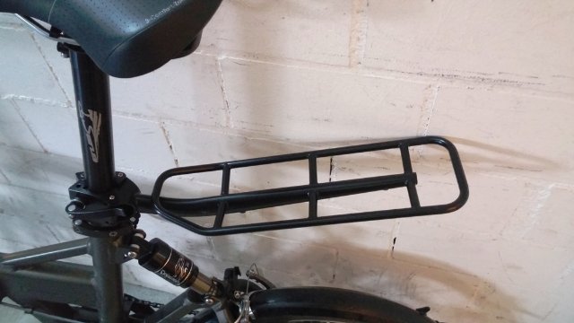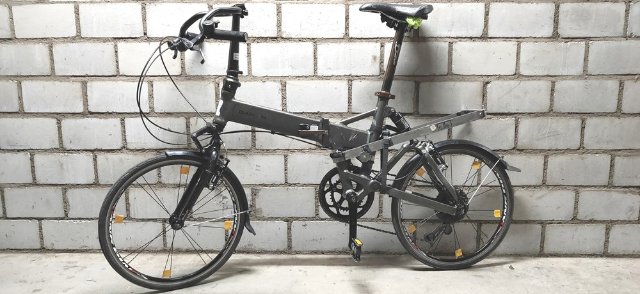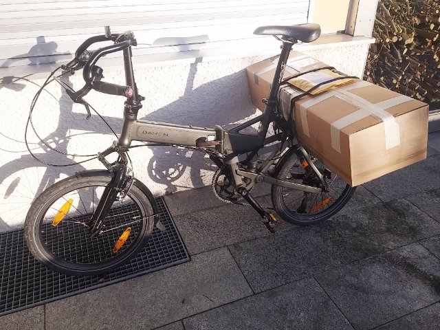 Beim Falten wird die Sattelstütze ganz hineingeschoben. Meine 600 mm lange ragt unten heraus, so dass das Rad in gefaltetem Zustand nicht auf dem großen Kettenblatt, sondern auf der Sattelstütze steht. Das klappt allerdings bereits nicht mehr, wenn ich meinen Tubus-Pickup-Gepäckträger (https://www.amazon.de/Tubus-Gep%C3%A4ck ... oding=UTF8) an die Sattelstütze geschraubt habe. Dummerweise muss man ihn bei jeder Montage wieder neu längs ausrichten. Aber eigentlich brauche ich ihn nur für „Schwertransporte“. Er wiegt 650 g. Zugelassen ist er bis 10 kg. Allerdings hatte ich auch schon mal 22 kg draufgepackt. Ohne bleibende Schäden