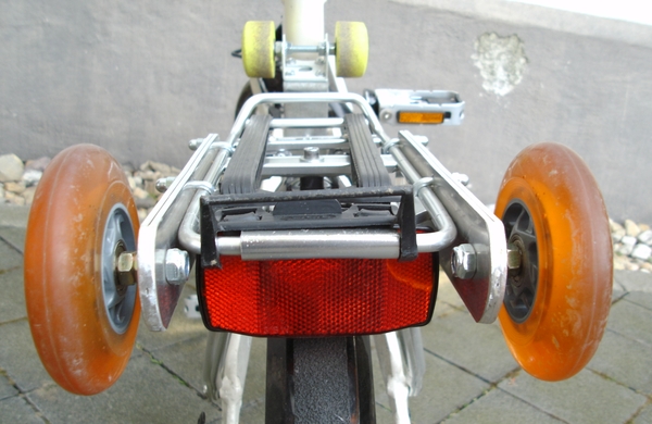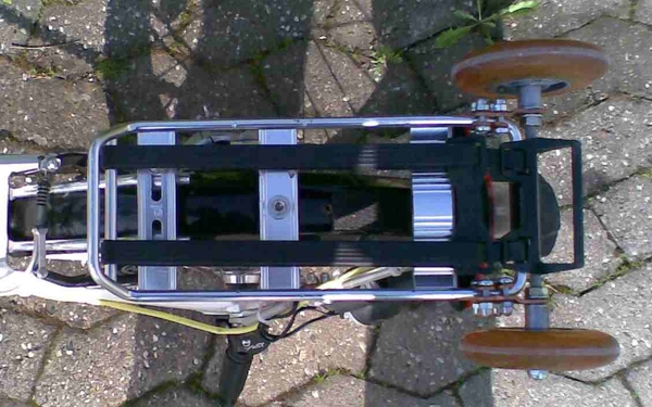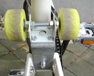 HIer habe ich einfach einen sehr stabielen Stahlwinkel genommen und ihn genau so zugeschnitten das er in die Schwinge paßt. Verschraubt habe ich diesen mit der Schraube die auch den Dämpfer hinten festhält. Auf den Winkel habe ich dann ein U-Profil gesetzt durch das eine Gewindestange führt an dem die Rollen von Rollschuhen befestigt sind. Einfach aber bis heute ohne technische Probleme.