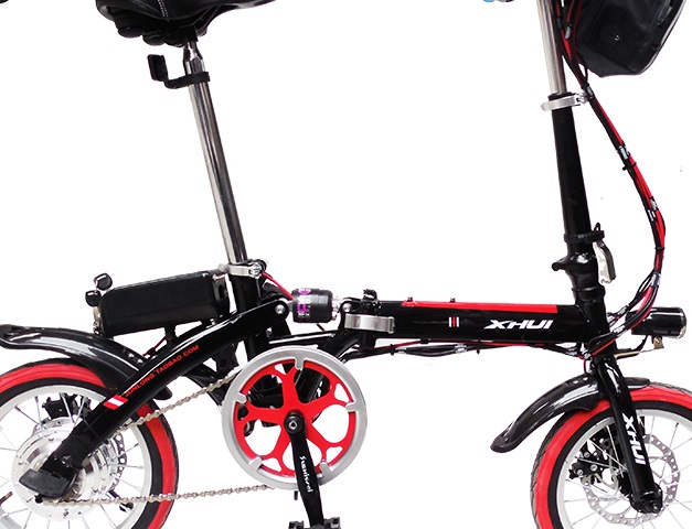 Mit Elektromotor vorn. Sieht nach einem Cute Q85 aus, ist mit 82mm Achsbreite und 1,7kg angegeben.