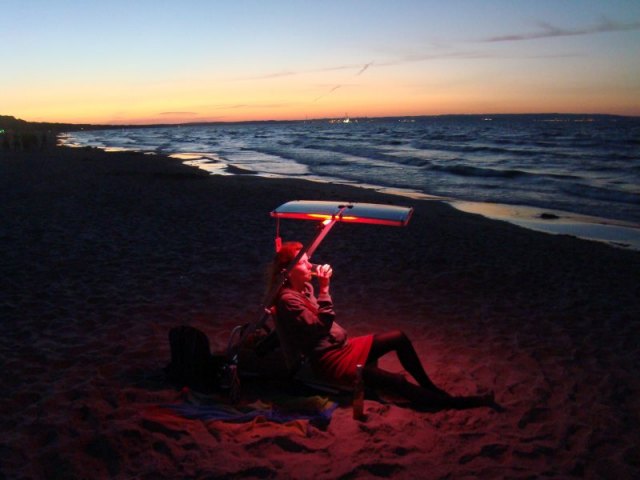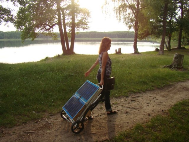Das blau beleuchtete Nachtbild drängt einen weiteren Verwendungszweck auf: Als Höhensonne aufgerüstet kann der Tourist mit wenig Zeit auch nachts bräunen und so in kürzester Zeit den nötigen Urlaubslook zum Nachbarn neidisch machen erzeugen. :lol: Im Ernst: Schick und coole Idee und da ist noch Potential drin! Die Variante mit Solarpanel auf einem Rad-Anhänger mit Box hat z.B. hier schon mal jemand gebaut: http://www.kapege.de/radeln/mono.txt?page=5