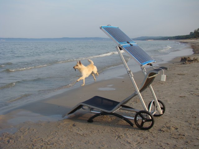 Ich habe über den Sommer mir eine Alu/Holz- Solarfaltliege mit dem prosaischen Namen Strandkraftwerk gebaut. Zuerst als Sonnenschutz und externe Ladestation für meine Pedelecakkus gedacht, hat es jetzt ein Eigenleben entwickelt. Das Besondere ist das drehbare und faltbare Solardach, derzeit 40 Wp, inklusive einer Powerbank, die USB und 12V abgeben kann. Daneben hat das Dach noch 2 direkte 12 V Dosen, um bei Sonnenschein diverse Geräte wie Smartphone, Tablet oder Notebook aufzuladen, aber auch 12 V Geräte wie Kühlboxen zu betreiben.
