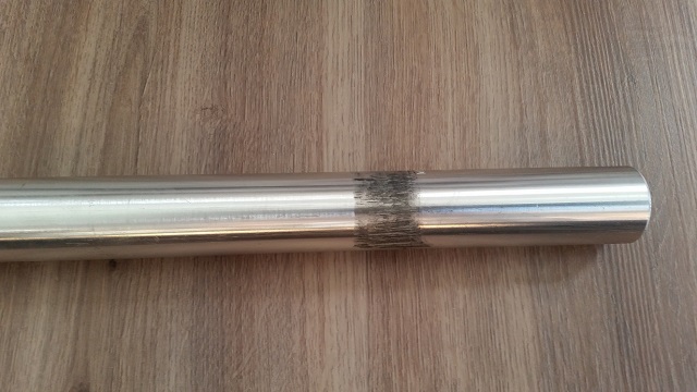 Da die Sattelstütze in einem Faltrad verwendet wurde, welches öfters gefaltet wurde, sind einige Gebrauchsspuren, besonders auf Höhe der Klemmung zu erkennen. Diese sind nur optischer Natur und beeinflussen nicht die Tragfähigkeit.