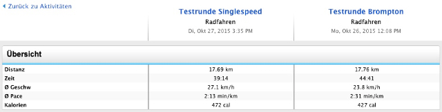 Jetzt war ich mal neugierig und hab mein aktuellstes Spielzeug (ein Garmin Edge 20) zum direkten Vergleich benutzt. Die Rahmenbedingungen waren für beide Fahrten und beide Räder nahezu identisch (max. Reifendruck, gutes Wetter und Windstille, alle beweglichen Teile gut gepflegt, durchschnittlicher Fitnesslevel und vom subjektiven Gefühl her etwa gleich viel Einsatz gegeben).