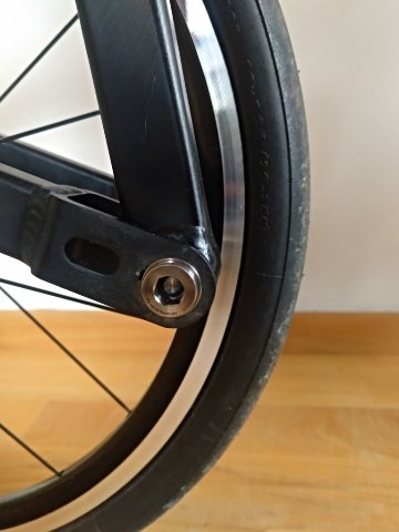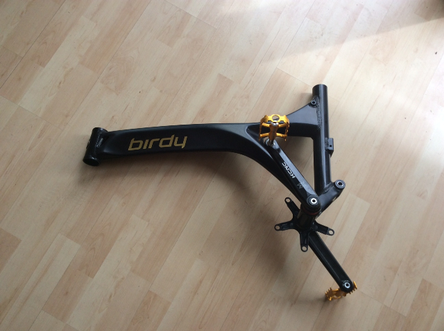 Bei der Hinterradschwinge war bei meinem Birdy ab Händler lediglich ein Stahlbolzen eingebaut und (mit zwei Plastikscheiben zusammen) festgeklemmt - laut Anleitung soll dieser aber in zwei Hülsen gelagert sein.