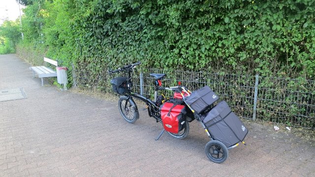 Bild mit Hänger auf dem Gepäckträger hatte ich beim Tern BYB schon mal gepostet. Auf dem Heimweg fahre ich durch und kaufe nach Belieben ein. Mit einem Trolly kann man aufgrund der schrägen Fläche auch mal 2 Meter Teile transportieren. Bei einem waagerechten Hänger ist das nicht ganz so unkompliziert (geht auch..muss man vorsichtiger ums Eck fahren und durch Bodenwellen)
