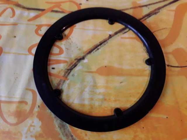 Diese Kettenschutzscheibe stammt von meinem Dahon. Sie schützt die Hose vor der Kette auf Kettenblättern bis zu 53 Zähnen. Sie wird mit fünf kleinen Schräubchen im Durchmesser von ca. 18,2 cm montiert. Der Außendurchmesser beträgt ca. 23 cm. Ich brauche sie nicht mehr, weil ich ein größeres Kettenblatt montiert habe. Das Material ist schwarzer Kunststoff, der sehr leicht und dennoch stabil ist. Sie ist natürlich benutzt und zeigt entsprechende Spuren wie kleine Kratzer, die man nur bei genauem Hinschauen sieht, aber keine Risse. Ich habe noch mehr Fahrradteile eingestellt!