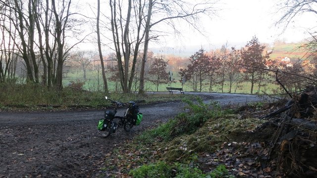 Hier war ich Ende November, bei schönem Wetter und Temperaturen so um die + 3 Grad allerdings mit der Stoff- Gepäckträgertasche statt Korb auf dem Knüllbahnweg in Nordhessen unterwegs.