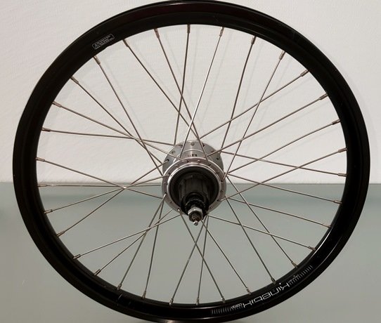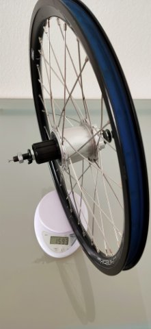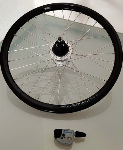 Ich verkaufe zwei gebrauchte Laufräder für Falträder in 20 Zoll (406). Hier geht es um das Hinterrad. Wie auf den Bildern ersichtlich ist die Felge schwarz. Es ist eine Kinetix-Comp-Hohlkammerfelge mit 32 Speichen. Die Felgeninnenbreite beträgt 17 mm, außen 22 mm. Das Felgenbett ist mit einem Hochdruckfelgenband ausgekleidet. Bremsflanken gibt es nicht, dafür eine Scheibenbremsaufnahme für den IS-2000-Standard mit 6 Schrauben. Die Speichen sind silberfarben. Die Nabe besteht aus einer SRAM Dual-Drive-Dreigangnabe DD-3. Die Einbaubreite beträgt 135 mm. Gewicht 1.593 g. Mit dazu gehört auch die Klickbox.