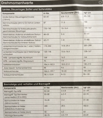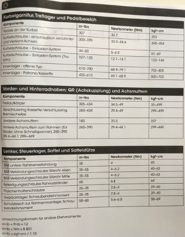 Aus dem „Owners Manual“ was bei meinem Rad dabei war, ist diese Tabelle mit den Drehmomentwerten dabei, falls irgendwas von hilft: