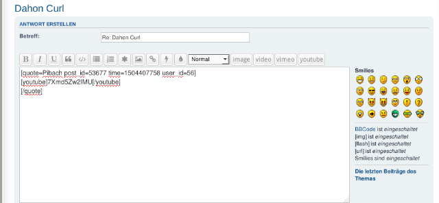 Bei meinem Linux und "Iceweasel"-Browser sieht Dein Post so aus: In dem Editor-Fenster für die Antwort, sieht das dann (mit Zitier-Option) so aus: Wenn ich da dann die YT-Nr extrahiere, finde ich natürlich das Video: