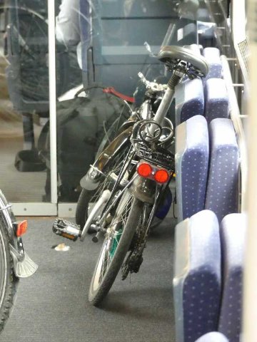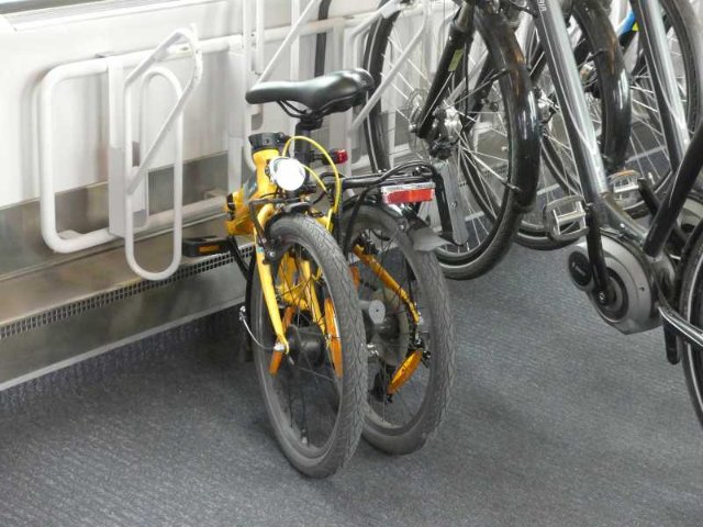 Die wenigsten Falträder haben ein Ticket und eine Platzreservierung. Auf den Fotos sieht das Abteil leer aus. Auf manchen Teilstrecken waren aber alle Fahrradständer ausgebucht. Dann wird's verdammt eng. Wenn dann noch vier Radfahrer in das falsche Fahrradabteil drängen, geht gar nichts mehr. Bis das Chaos wieder aufgelöst ist, vergehen schon mal zehn Minuten. So praktisch die Fahrradabteile sind, in der Hauptsaison sind sie mir zu wuselig und ich werde wieder mehr im Bistro mitfahren.