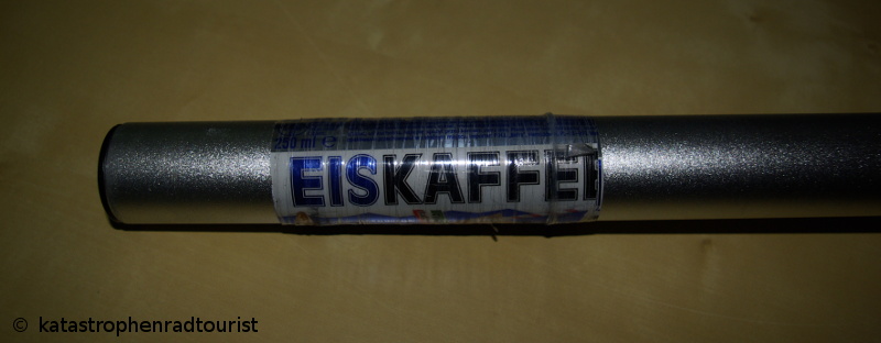 Nachdem ich sehr viele Radläden abgeklappert habe, in der Hoffnung doch noch eine andere Reduzierhülse zu bekommen, oder eine passende Sattelstütze. Leider überall vergeblich. Ein Abdrehen der Stattelstütze wäre zwar auch möglich gewesen, hätte aber die Wandstärke vermindert und den schicken Matteffekt zerstört. Nachdem mir dann ein netter Fahrradladenbesitzer und Schrauber zu einer Coladose rieten, war ich zunächst skeptisch. Aber nichts zu verlieren. Also eine Dose Eiskaffee erworben (Wert 59 ct) und ca. eine halbe Rolle Tesafilm. Nach 20 km teilweise über Kopfsteinpflaster hat sich die Stütze noch keinen Millimeter bewegt.
