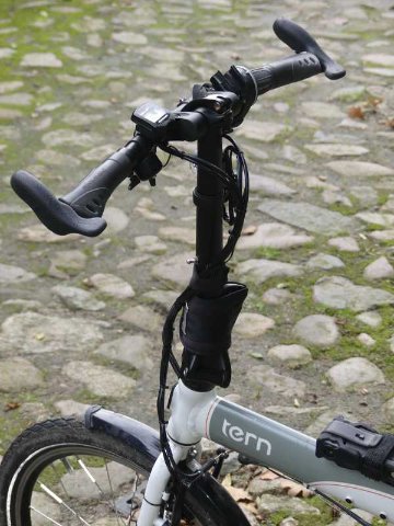 Manchmal hat sich das Bündel beim Falten unter dem Faltgelenk der Lenksäule verklemmt. Nun sind die hinteren Züge rechts an der Lenksäule entlang gelegt, wie es die aktuellen Tern-Modelle auch haben.