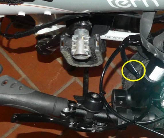 Der Bowdenzug des linken Bremsgriffs scheuerte beim Hinterherziehen des gefalteten Rads am Vorderrad: