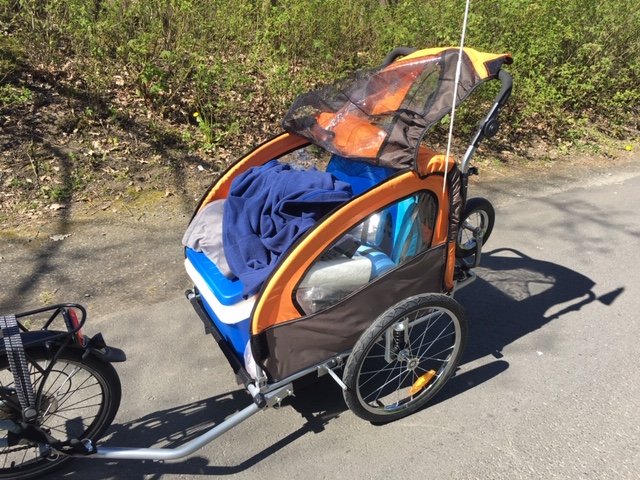 Bis hierhin gibt es soweit von meiner Seite aus nichts zu beanstanden. Klar, Verarbeitungsqualität kann mit Thule oder Croozer nicht wirklich mithalten. Aaaaber, für unsere Zwecke doch völlig ausreichend. Die Abdeckhaube von der Kabine ist alles mit Klettverschlüssen. Manchmal etwas mühselig beim zumachen aber halb so wild. Für die gelegentlichen Ausflüge für uns völlig ausreichend.