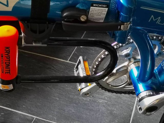 - Bügelschloss montiert (passendes 1,20m Stahlseil wird bei Bedarf in die Tasche gepackt)