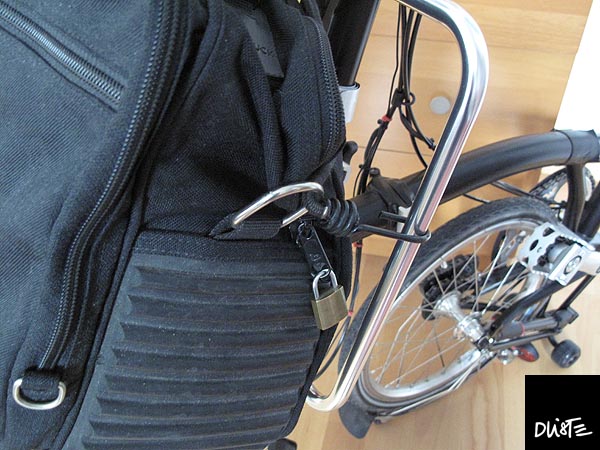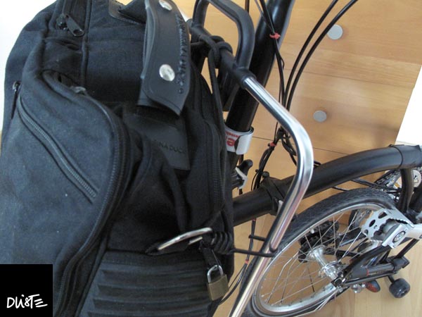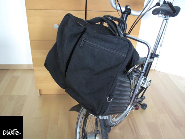 Die Tasche ist mindestens 30 Jahre alt - ein Designerstück (Mandarina Duck), das mich auf allen Geschäftsreisen begleitete. Jetzt habe ich sie mal mit einem Gummiseil an den Brompton Taschenrahmen gespannt. Das Seil ist unter dem Rahmengriff eingehängt. Die Enden gehen durch die Ösen für den Tragegurt und hängen dann am Rahmen. Das sitzt sehr sicher und lässt sich schnell an- und abmachen.