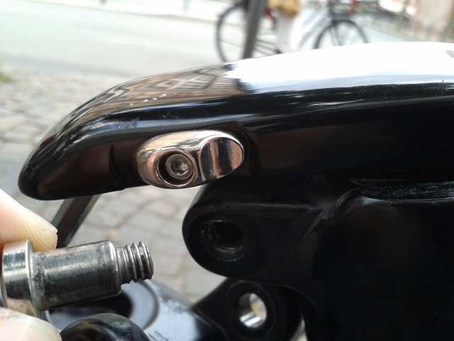 Die Lenksäule bei Tern wird im Faltgelenk nicht durch einen durchgehenden Bolzen, sondern links und rechts durch jeweils eine Schraube gehalten. Hier ist die rechte Schraube zu sehen.
