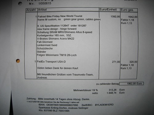 Ich verkaufe zwei nagelneue Bike Friday Reisefalträder. Beide Räder sind Baujahr 2015 und wurden keinen Meter gefahren. Beide Räder haben auch bereits das neue Rahmendesign "hinge foward", welches beim Falten das Herunterfallen der Kette verhindert. Die Bike Fridays sind hinsichtlich der Ergonomie und Ausstattung vielseitig anpassbar. In dieser Anzeige handelt es sich um ein grünes New World Tourist in der Rahmenhöhe M. Die Ausstattung (siehe Rechnung und Fotos) ist einfach aber funktionell und lässt Raum für Tuning. Fragen beantworte ich gerne via Mail. VB: Euro 1460,-
