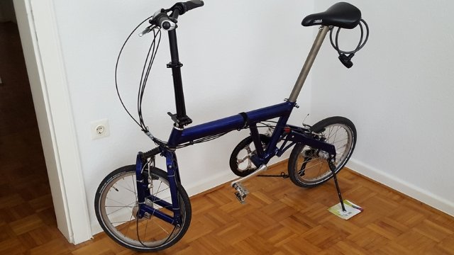 Der Vorbesitzer hatte zudem die Seitenstütze von einem jüngeren Modell außen an das Ausfallende montiert, was nach einigen Betätigungen dazu führte, dass sich die Stütze immer verdrehte und das Innengewinde der Achsmutter irgendwann ausgelutscht war. Jetzt habe ich die Stützen nach innen verbaut, so dass sie fixiert ist, befürchte aber, dass sich das auf den Kettenbetrieb auswirkt, weil die Ritzel jetzt ja dann etwas weiter außen liegen. Nach Justierung der Schaltung, läuft es aber recht gut; der Geradeauslauf/ das Einstellen der Spur ist ja nicht so einfach möglich... Ohne Seitenstütze ist es aber auch etwas ätzend, wenn man es nicht jedes Mal zusammenfaltet. Das Zusammenfalten klappt recht gut, nur bleibt es nicht gerade stehen, vlt. auch weil die Halteschrauben in der Vordergabel fehlen und vlt. auch, wg. der innen eingebauten Seitenstütze, da muss ich noch einmal schauen.