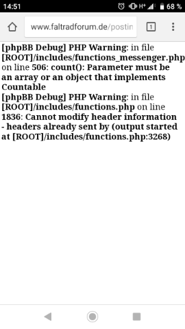 Das scheint vor allem aufzutreten, wenn ich die erste Antwort schreibe. Auf Seite sonstwo bekomme ich den Fehler nie. Die zweite Meldung ist eine Folge der ersten, die Ursache der weißen Seite sollte in den Serverlogs stehen, aber ich vermute, irgendeine Modifikation ist schuld.[phpBB Debug] PHP Warning: in file [ROOT]/includes/functions_messenger.php on line 506: count(): Parameter must be an array or an object that implements Countable