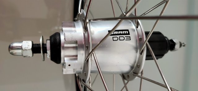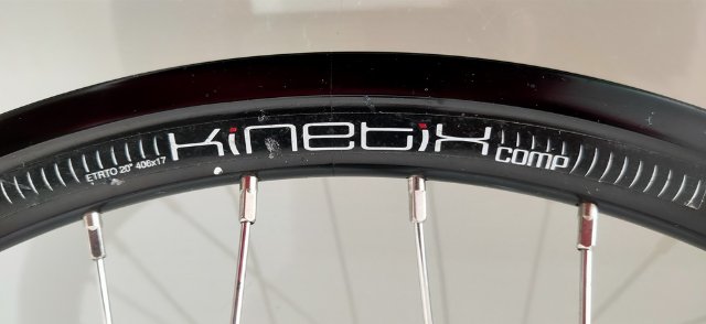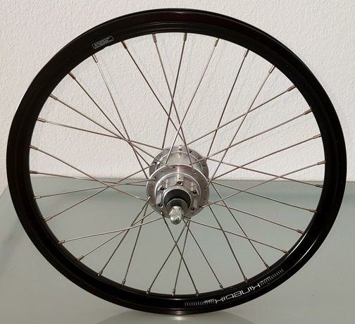 Ich verkaufe zwei gebrauchte Laufräder für Falträder in 20 Zoll (406). Hier geht es um das Hinterrad. Wie auf den Bildern ersichtlich ist die Felge schwarz. Es ist eine Kinetix-Comp-Hohlkammerfelge mit 32 Speichen. Die Felgeninnenbreite beträgt 17 mm, außen 22 mm. Das Felgenbett ist mit einem Hochdruckfelgenband ausgekleidet. Bremsflanken gibt es nicht, dafür eine Scheibenbremsaufnahme für den IS-2000-Standard mit 6 Schrauben. Die Speichen sind silberfarben. Die Nabe besteht aus einer SRAM Dual-Drive-Dreigangnabe DD-3. Die Einbaubreite beträgt 135 mm. Gewicht 1.593 g. Mit dazu gehört auch die Klickbox.