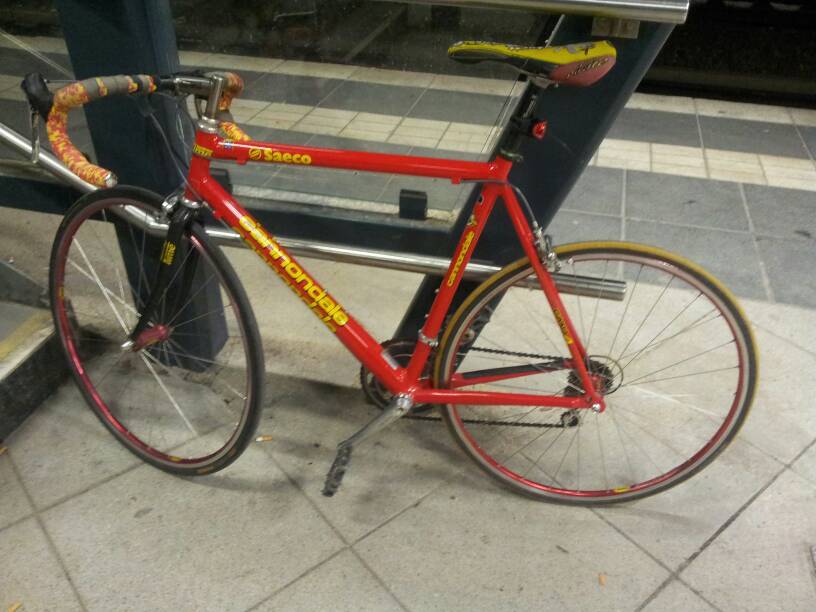Emil, ich glaub Du hast es schon erraten. Es ist ein Cannondale Team Saeco CAAD 4, Mario Cipollini war damit erfolgreich, ich glaub es ist Jahrgang 2001. Hat Carbongabel, komplett Dura Ace, Mavic Helium Laufräder, Titanium Lenker. Gewicht etwa 8kg, muss es noch genauer wiegen. Fährt sich sagenhaft, bin echt begeistert. Rennradlenker gefällt mir aber nicht, baue das vrstl auf Bullhorn um. Bremsleistung könnte auch besser sein.