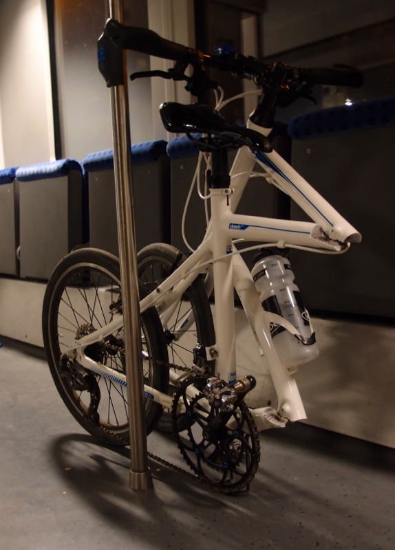 ..gefaltete Bromptons in S-Bahn Amsterdam, 1 M 10 RD (rot) und 1 M 12 RD (grün) -- beides T-Modelle